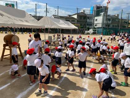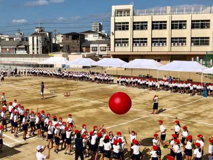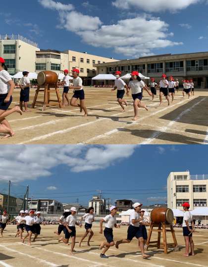 大玉送りは大玉が弾むごとに子どもたちの歓声が響き渡り、とても盛り上がっていました。応援合戦は、練習を重ねてきた応援団の迫力ある応援に引っ張られ、全校児童も大きな声で掛け声を上げ、応援歌を歌うことができました。