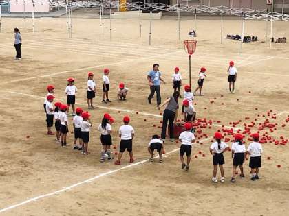 1年生が団体競技の「100人でレッツトライ」(玉入れ)の練習をしています。紅白に分かれて投げています。