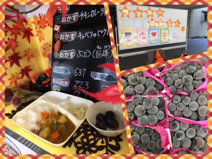 本日の給食は、「チキンカレーライス[米粉]、牛乳、キャベツのピクルス、ぶどう(巨峰)」でした。