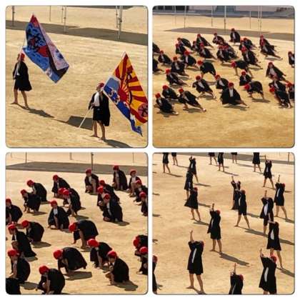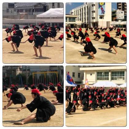 団体演技「心を一つに! 育和ソーラン!!」で、今日初めて本番のスタイル、はっぴを着て踊っています。黒のはっぴを着ている姿は凛々しいものがあり、迫力が出てきました。本番を楽しみにしていてください。
