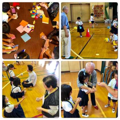 「こま・まりつき・おてだま・折り紙・缶ぽっくり・けん玉」6つの昔遊びを順にまわり、楽しく教えていただきました。身近にできる遊びなのでこれからも続けてほしいですね。