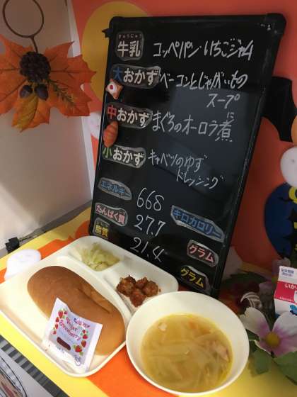 本日の給食は、「コッペパン、いちごジャム、牛乳、まぐろのオーロラ煮、ベーコンとじゃがいものスープ、キャベツのゆずドレッシング」でした。