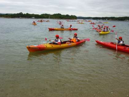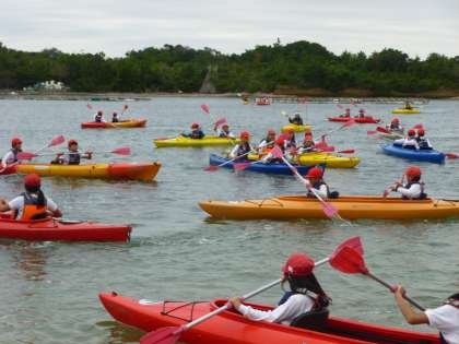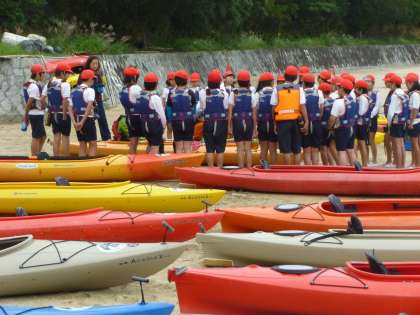 10月15日(水)6年生129名が伊勢志摩方面の修学旅行に出かけました。その様子をお伝えします。志摩自然学校のある英虞湾の内海でシーカヤック体験を行いました。事前に自然学校の先生より事前指導を受け、2人ひと組で海にこぎだし、内海の島を半周しました。最初はぎこちなかった操縦も、すぐに慣れてどんどん沖合に向かいました。最高に爽快な体験でした。