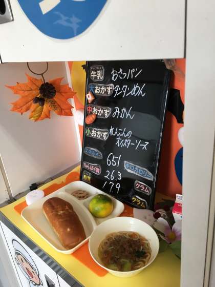 本日の給食は、「おさつパン、牛乳、タンタンめん、れんこんのオイスターソース焼き、みかん」でした。
