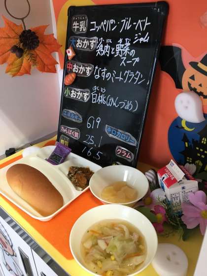 本日の給食は、「コッペパン、ブルーベリージャム、牛乳、なすのミートグラタン、鶏肉と野菜のスープ、白桃(カット缶)」でした。