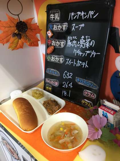 本日の給食は、「パンプキンパン、牛乳、豚肉と野菜のケチャップソテー、スープ、スイートポテト」でした。