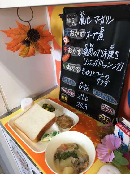 本日の給食は、「食パン、マーガリン、牛乳、鶏肉のみそマリネ焼き[ノンエッグドレッシング]、スープ煮、きゅうりとコーンのサラダ」でした。