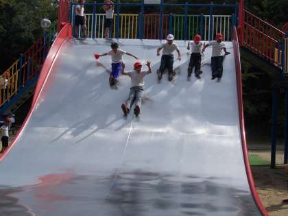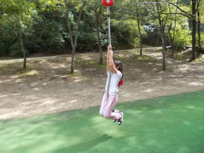 公園内では、河内の里とやんちゃの里に行きました。河内の里では、稲やかぶ、綿、そして動く水車など都会ではなかなか見ることのできないものを見ることができました。やんちゃの里に移動し、おいしい手作りのお弁当をいただき、お菓子を食べた後、思い思いに遊んでいました。たくさんの種類の滑り台やターザンロープなどの大型遊具で遊ぶ子、虫探しに走り回る子、栗やどんぐり探しに夢中な子とみんな汗だくになりながら遊んでいました。頑張っていっぱい歩いた甲斐がありました。