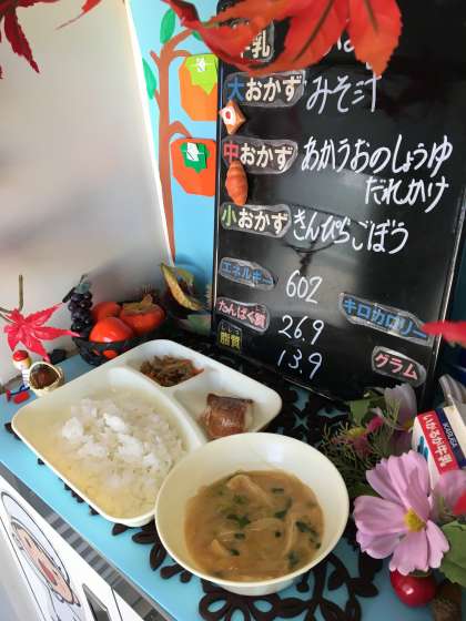 本日の給食は、「ご飯、牛乳、あかうおのしょうゆだれかけ、みそ汁、きんぴらごぼう」でした。