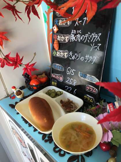 本日の給食は、「おさつパン、牛乳、豚肉のデミグラスソース、スープ、きゅうりのサラダ」でした。
