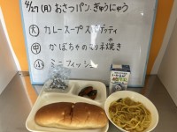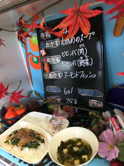 本日の給食は、「ビビンバ、牛乳、わかめスープ、アーモンドフィッシュ」でした。