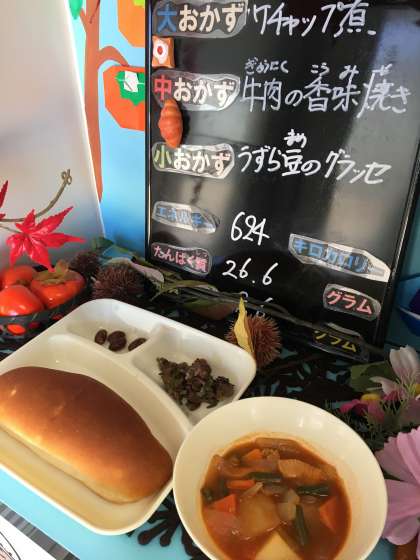 本日の給食は「おさつパン、牛乳、牛肉の香味焼き、ケチャップ煮、うずら豆のグラッセ」でした。