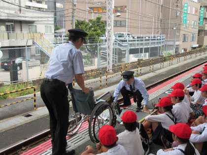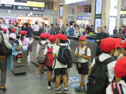 2年生は、学校から天王寺駅までの小さな旅へ出かけました。「子どもたちだけで小さな旅にチャレンジするよ。」と言うと、不安そうにしている子どももいましたが、ボランティアの方々の協力もあり、全員が無事に切符を買い、天王寺駅まで旅をすることができました。天王寺駅では、駅員さんに天王寺駅や電車のこと、働く人の様子、点字や車いすの方が利用するスロープなどの人にやさしい工夫について教えていただきました。子どもたちも行く途中の道や駅の中などで人にやさしい工夫をたくさん見つけていて、教室に帰るとたくさん見つけたことを発表していました。小さな旅を終えて、子どもたちの顔は達成感に満ちあふれ、とてもいきいきとしていました。これから学校や家や地域などの身近にある、人にやさしい工夫をみつけていく学習をしていきます。