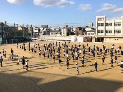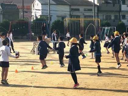 2学期は、なわとび運動です。5年・6年生からスタートしました。運動委員会の児童が前でお手本を見せながら元気に跳んでいます。