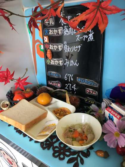 本日の給食は、「食パン、マーマレードジャム、牛乳、豚肉とキャベツのスープ煮、変わりピザ、みかん」でした。