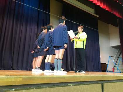 25日、体育館で児童朝会を行いました。まずはソフトバレーボールの大会で賞を取ったみなさんの表彰を行いました。その後、チャレンジランキングに参加してがんばった児童のみなさんにお褒めの言葉があり、担任の先生を通じて賞状を受け取ってくださいとのお話がありました。