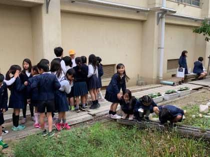3日、1年生、3年生、5年生を対象としたビオトープ開放が行われました。普段は授業以外で入ることはないビオトープへ自由に入り、ビオトープで生きる動植物を見てもらいました。