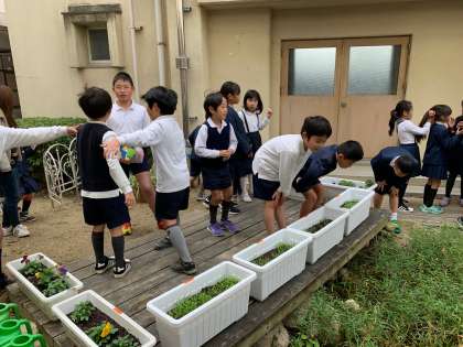 ちょうど紅葉した葉っぱがたくさん落ちており、紅葉狩りをしている子もいました。虫のまゆや抜けがらを見つけて喜んでいる子もいました。ビオトープ委員さんが育てている「ねぎ」「サボテン」「ほうれんそう」などを観察している子もいました。