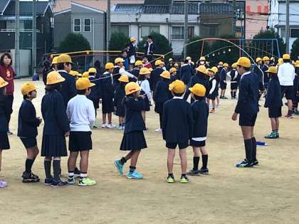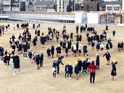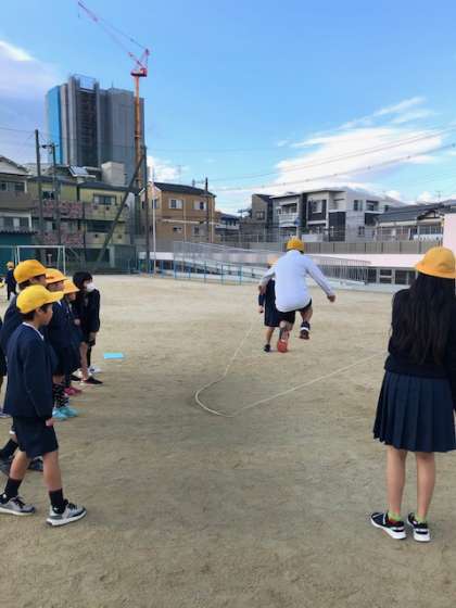 たてわり班で仲よく長なわとびをしています。8の字跳びや全員跳びで少しずつうまくなってきています。