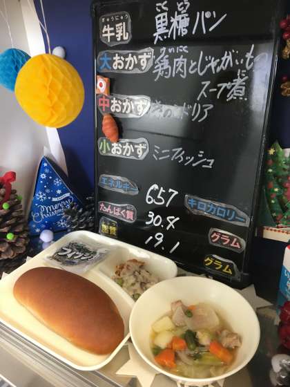 本日の給食は、「黒糖パン、牛乳、鶏肉とじゃがいものスープ煮、きのこのドリア、ミニフィッシュ」でした。