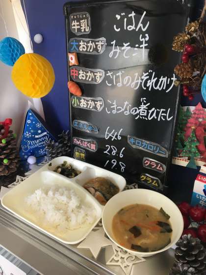 本日の給食は、「ご飯、牛乳、さばのみぞれかけ、みそ汁、こまつなの煮びたし」でした。