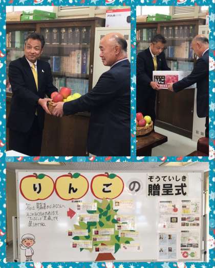 本日、りんごの贈呈式がありました。これは、東部市場の食育の一環として、「りんごの食べ比べ」の食育を毎年行っており、その功績が認められ、青森県からりんごが贈呈されました。