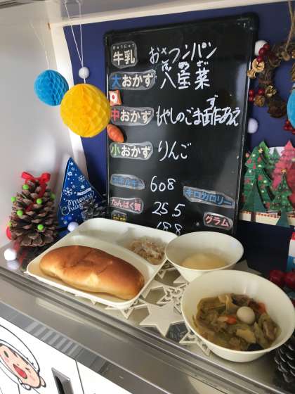 本日の給食は「おさつパン、牛乳、八宝菜、もやしのごま酢あえ、りんご」でした。