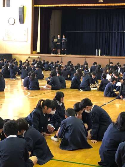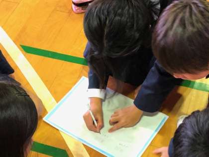 今朝は、イントロクイズで楽曲の最初の短いフレーズだけを聴いて考えました。ポップスやアニメソングなど、たて割りグループごとに仲よく相談して答えていました。