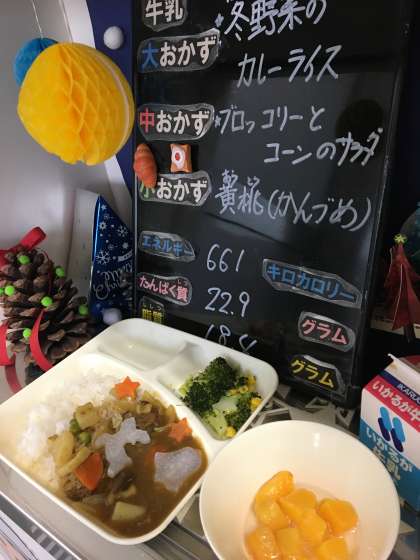 本日の給食は、「冬野菜のカレーライス、牛乳、ブロッコリーとコーンのサラダ、黄桃(カット缶)」でした。
