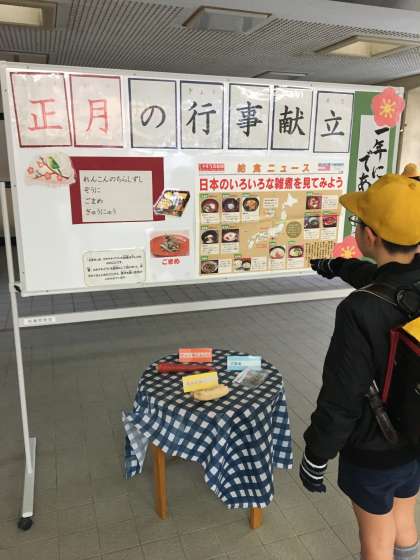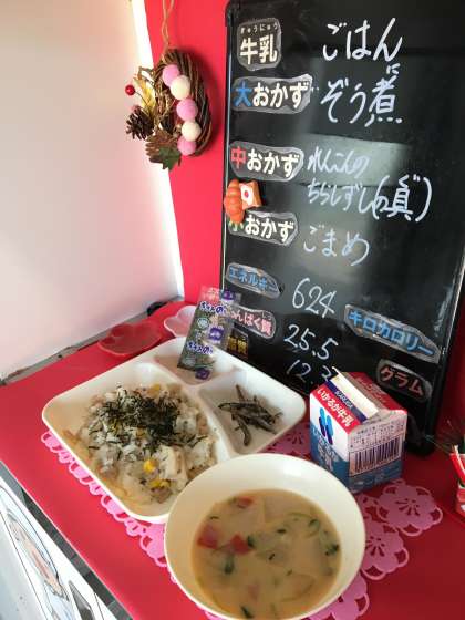 本日の給食は、正月の行事献立として「れんこんのちらしずし、牛乳、ぞう煮、ごまめ」でした。