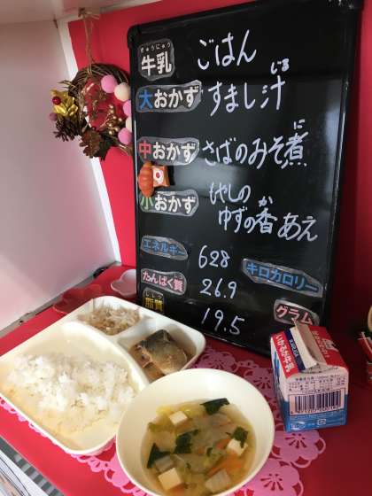 本日の給食は、「ご飯、牛乳、さばのみそ煮、すまし汁、もやしのゆずの香あえ」でした。