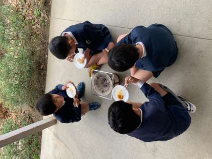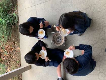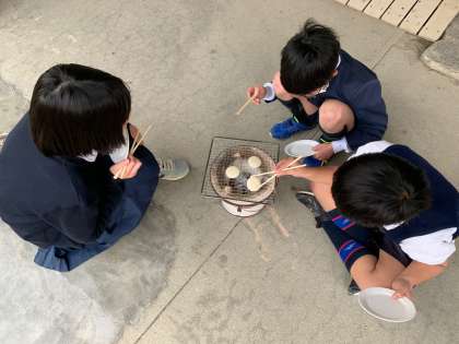 14日、3年生のみなさんが、社会科の「昔の道具」の学習に関連して七輪体験を行いました。七輪でおもちを焼いて、お醤油をかけて食べました。