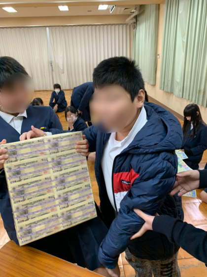 最後に、1億円のレプリカを持たせてもらいました。レプリカだとわかっていても、みんな目がキラキラして、持ち上げると嬉しそうな表情を見せてくれました。