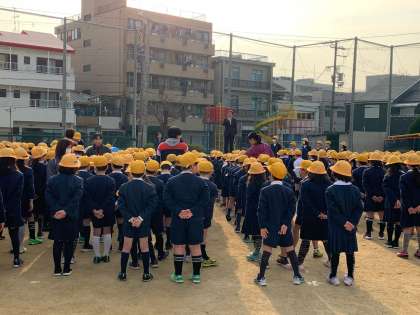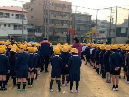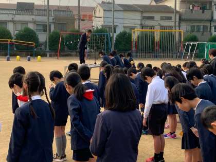 3日、運動場で児童朝会を行いました。節分の日ということで、病気やいじめ、なまける心の鬼をやっつけましょう、と、節分に関するお話をしていただきました。