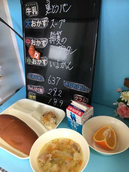 本日の給食は、「黒糖パン、牛乳、押麦のグラタン、スープ、いよかん」でした。