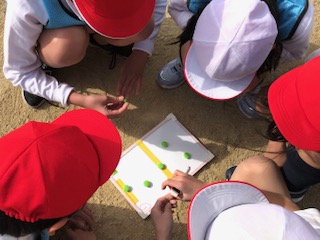 運動場での「ミニサッカー」です。本時の学習のめあては「パスをつなぐための作戦をたてて、みんなでゴールをめざそう」です。準備運動をした後、ボールタッチなどボール慣れをし、チームに分かれて作戦タイム。11の作戦からチームごとに決めています。