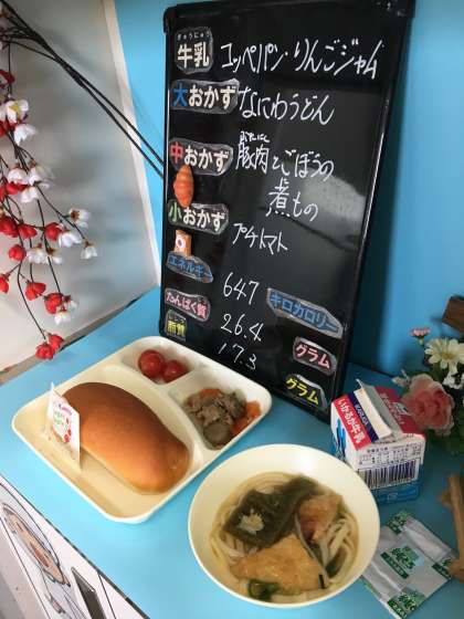 本日の給食は、「コッペパン、牛乳、豚肉とごぼうの煮もの、なにわうどん、プチトマト」でした。
