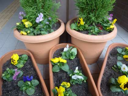 晩秋を迎え、玄関の花は夏の花であるベゴニアやインパチェンスからパンジーに交代しました。パンジーは、冬から来年の初夏ごろまでたくさんの花をつけ、子どもたちを迎えます。