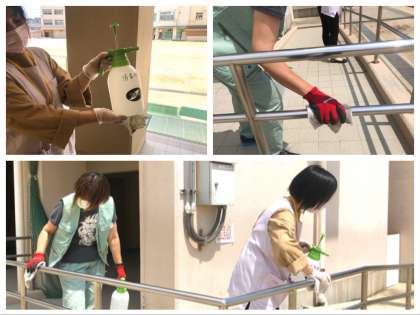 子どもたちが下校した後、明日に備えて、教室の机やいすは各担任の先生方で、手すりやトイレのドア、水道のカランなどは養護教諭や管理作業員等を中心に教職員で協力しながらアルコール消毒をしています。