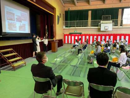 学校生活について、1年生 学年主任から持ち物や服装、お願いについてお話がありました。その後、学校の様子が分かるスライドを見てもらいました。