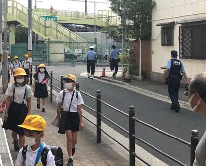 通学路では、交差点にPTA・地域見守り隊はぐぴーの方々が毎日立ってくださっています。昨日は東住吉警察の方が校門前と交差点等巡回してくださいました。ありがとうございます。