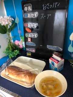 本日の給食は、「牛乳、おさつパン、スープ」でした。