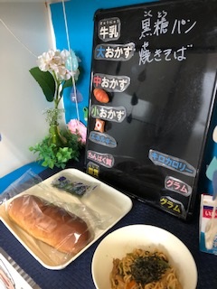本日の給食は、「黒糖パン、牛乳、焼きそば」でした。
