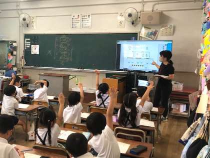 たし算の問題で、写されたモニターを見ながら積極的に手を挙げて発表しているところです。