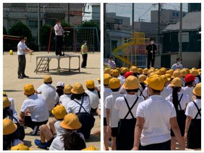 「お」さない、「は」しらない、「し」ゃべらない、「も」どらない、の約束を守って行動し、先生方のお話にもしっかり耳を傾けていました。次回は、さらに素早く行動できるよう、訓練していきたいと思います。