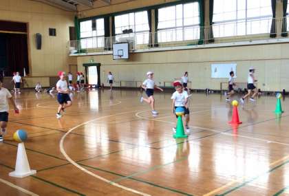 スタートダッシュしてボールの争奪戦。汗をかき、楽しく活動できました。