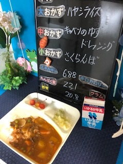 本日の給食は、「ハヤシライス、牛乳、キャベツのゆずドレッシング、さくらんぼ」でした。