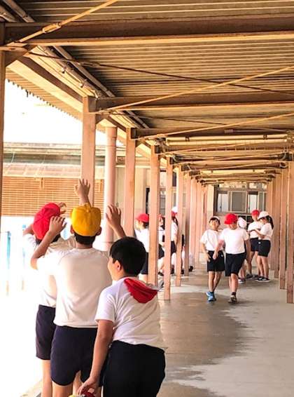 走った後は、渡り廊下のミストでひと休み、暑さを癒しています。