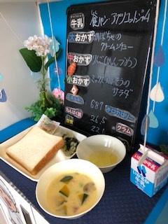 本日の給食は、「食パン、牛乳、かぼちゃのクリームシチュー、ミックス海そうのサラダ、りんご(カット缶)」でした。