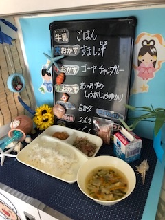 本日の給食は、「ご飯、牛乳、ゴーヤチャンプルー、すまし汁、あつあげのしょうがじょうゆかけ」でした。